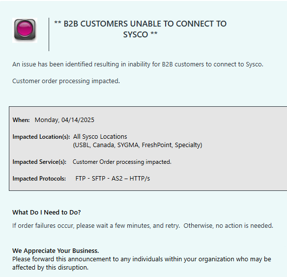 0 Sysco - System Unavailable 4/14/2025 Debbie Barr April 14, 2025 23:01 None Follow Facebook Twitter LinkedIn