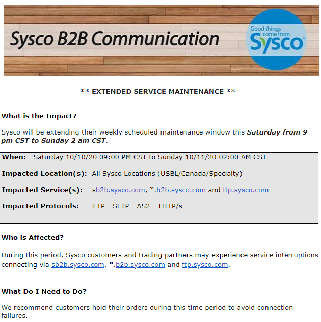 0 Sysco Extended Service Maintenance 10/10/2020 to 10/11/2020 Debbie Barr October 07, 2020 20:54 None Follow Facebook Twitter LinkedIn