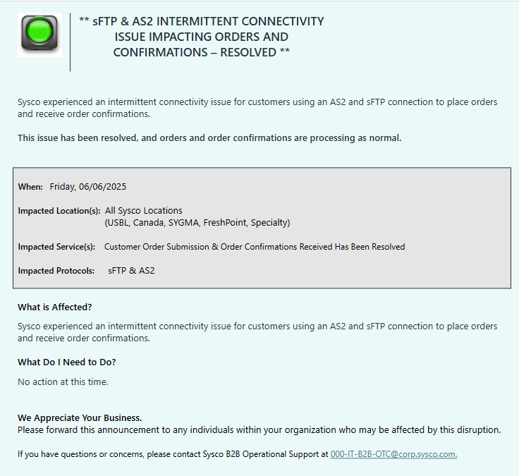 0 ** FTP CONNECTIVITY ISSUE IMPACTING ORDER SUBMISSION ** 6/6/2025 Debbie Barr June 06, 2025 18:17 None Follow Facebook Twitter LinkedIn