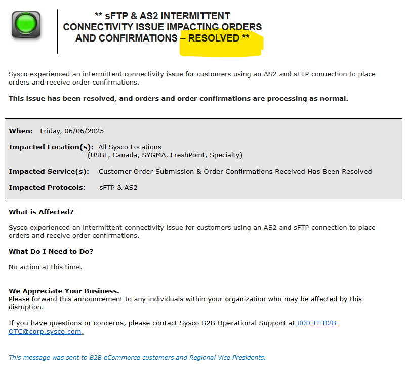 0 ** FTP CONNECTIVITY ISSUE IMPACTING ORDER SUBMISSION ** 6/6/2025 Debbie Barr June 06, 2025 18:29 None Follow Facebook Twitter LinkedIn