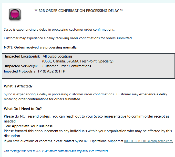 0 Sysco B2B Communication issue 7/10/2025 Debbie Barr July 10, 2025 20:53 None Follow Facebook Twitter LinkedIn