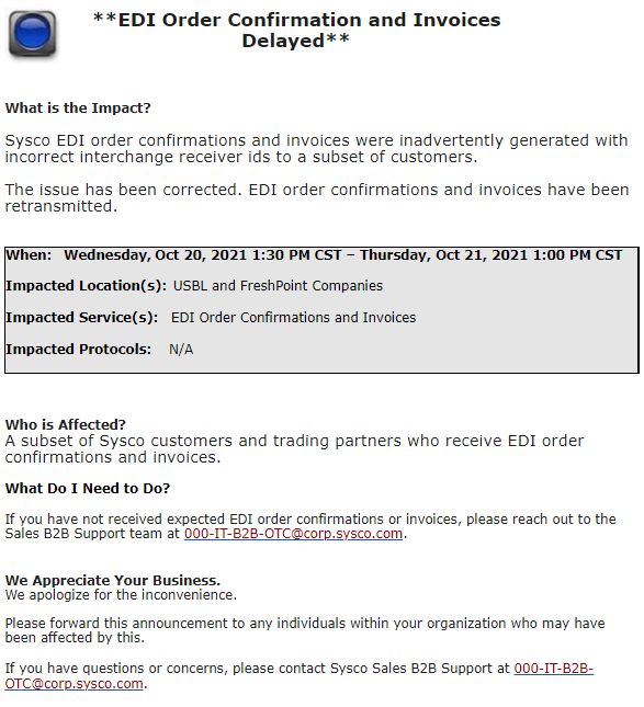 0 Sysco Order Confirmation Delay Resolved 10/21/2021 Debbie Barr October 22, 2021 13:44 None Follow Facebook Twitter LinkedIn