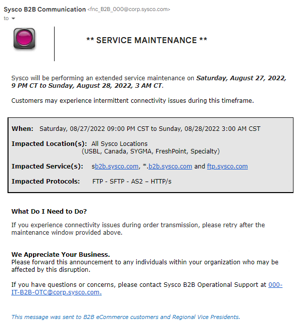 1 Sysco Service Maintenance 08/27 - 8/28/2022 Debbie Barr August 26, 2022 20:15 None Follow Facebook Twitter LinkedIn